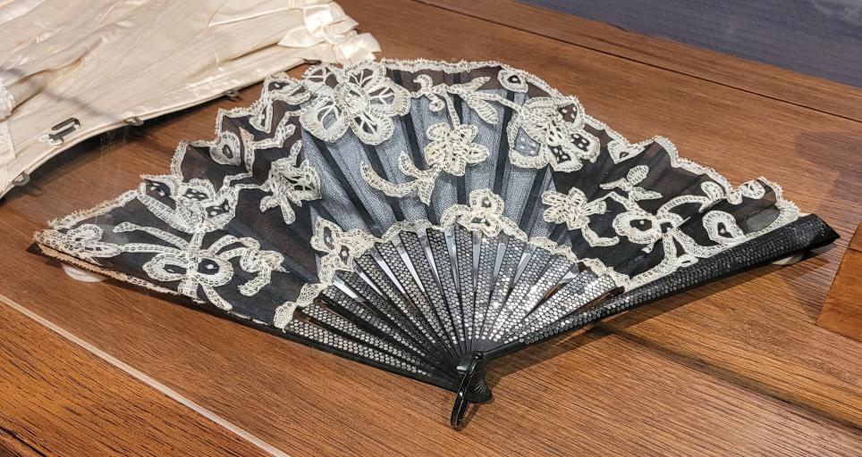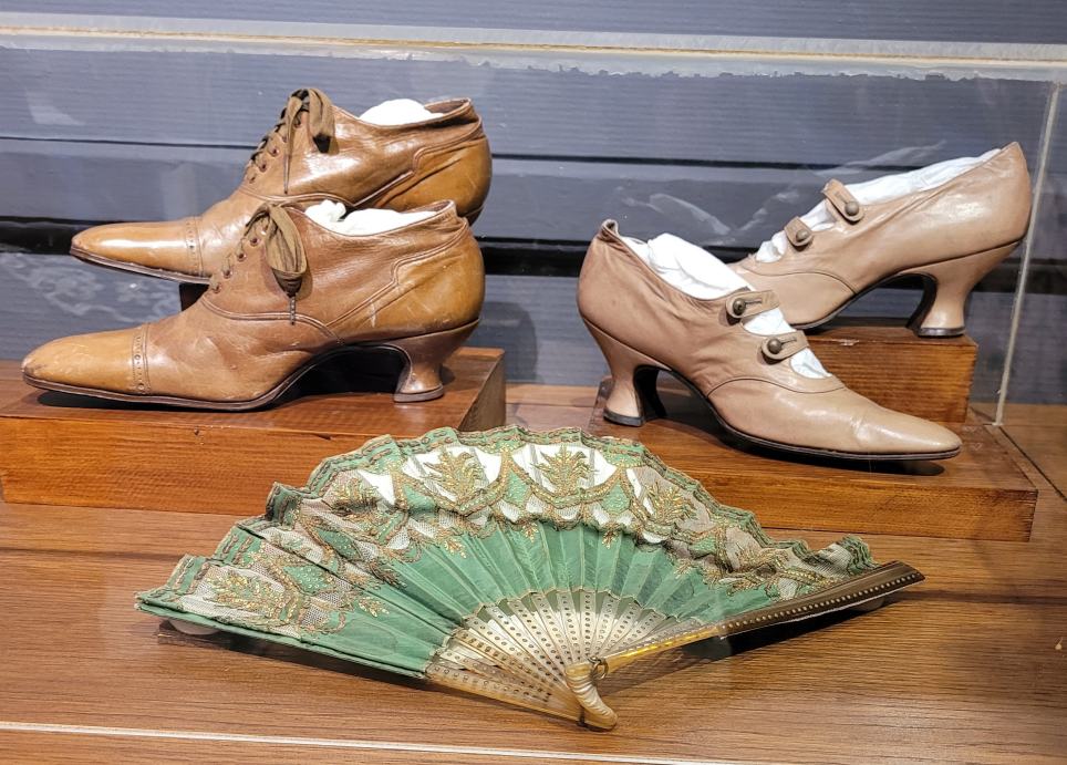 Paire de bottines de ville, Peau fauve, Vers 1900-1910 Paire de souliers, Chevreau noir brodé de perles d'acier, Vers 1890 Eventail, Corne blonde et taffetas vert pailleté, Vers 1900-1905