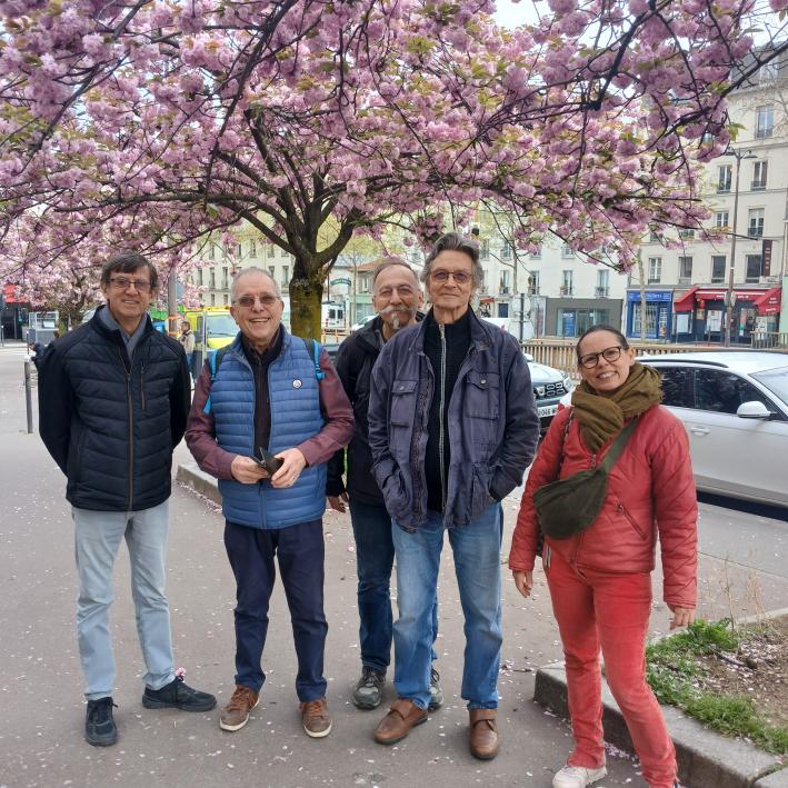 Sous les cerisiers en fleurs de la Place Bienvenüe : Hervé Jeandot, Jean-Luc Charpiot, Président de l'Académie des Arts de Gournay, Pierre Sacovy, Daniel Vittecoq et Anne-Marie Rosiñol, de l'Amicale artistique Chelloise (photo Corynne Sculfort, Présidente de l'Amicale)