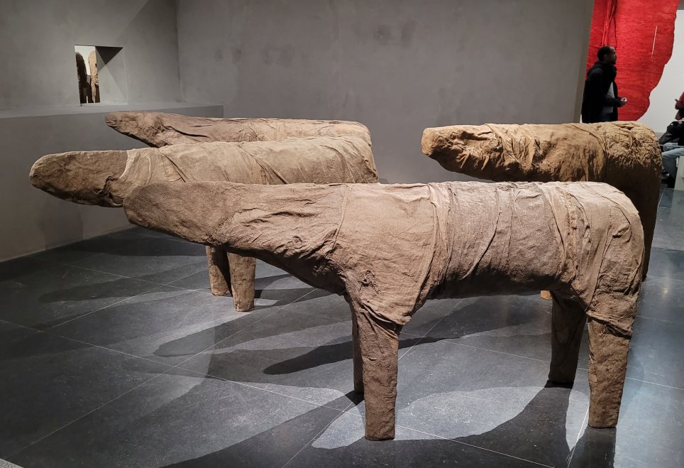 Mutants debout, 1992-1994, Toile de jute, résine et armature d'acier ("Quelles sont ces étranges bêtes ? Chiens, cochons, fourmiliers, animaux préhistoriques ou du futur ? Debout ou assis, ils nous semblent familiers - et pourtant, il est difficile de les nommer")