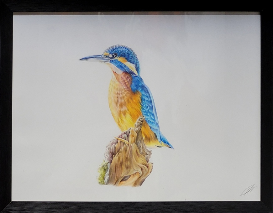 Mathilde CATHELAIN, Martin-pêcheur perché, Crayons de couleur sur papier blanc
