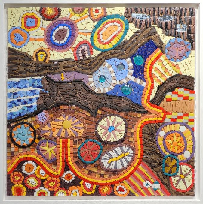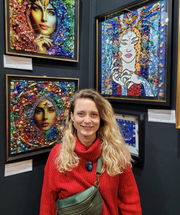 Clara TISSOT, Lalie, "Le temps n'appartient à personne. Ballet d'étoiles insaisissables. Instant présent, tu es l'essence du voyage." Mylène Farmer Oeuvre originale unique constituée de prierres semi-précieuses, pâtes de verre, cristaux Swarovski, perles fantaisies, éléments Haute Couture des années 1990 Réalisée par Clara TISSOT d'après un visuel créé par Art of Prima, 60*60