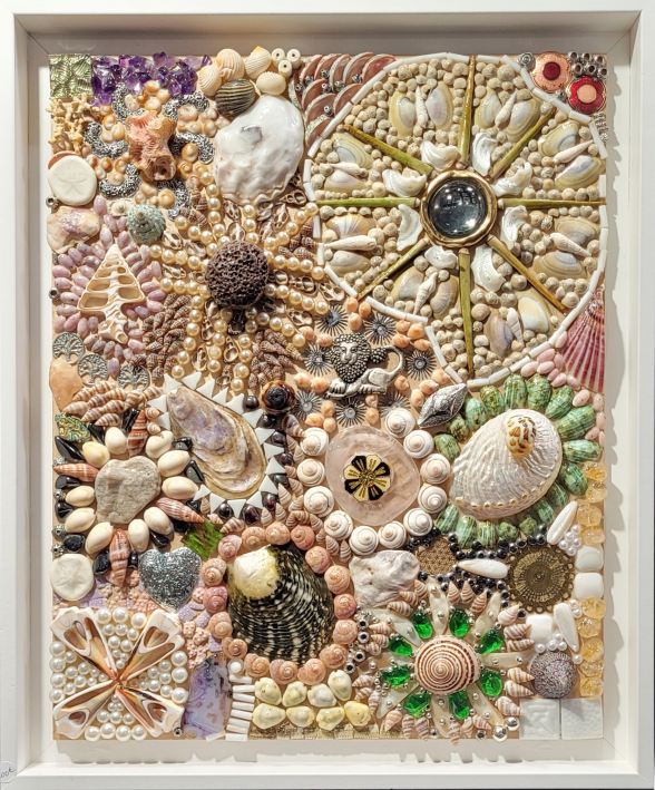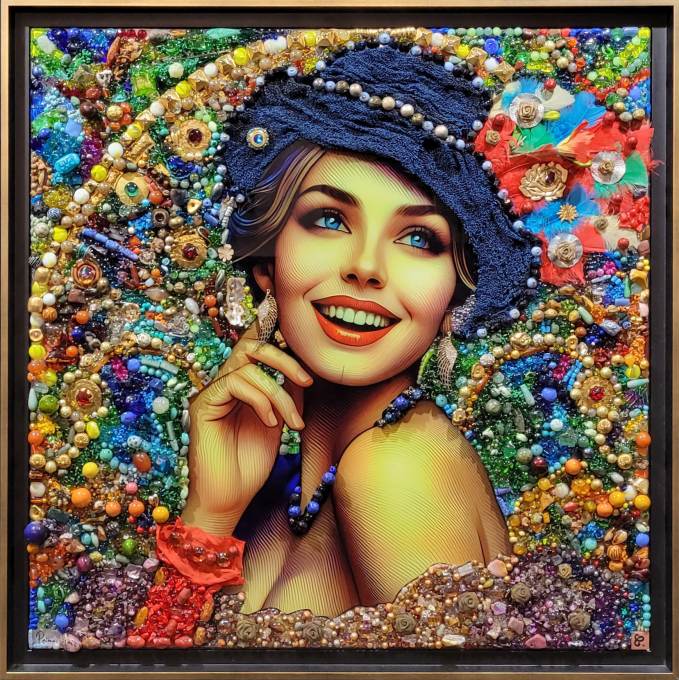 Clara TISSOT, Josette, "La vie est une fleur, l'amour en est le miel", Victor Hugo Œuvre originale unique constituée de prierres semi-précieuses, pâtes de verre, cristaux Swarovski, perles fantaisies, éléments Haute Couture des années 1990 Réalisée par Clara TISSOT d'après un visuel créé par Art of Prima, 90*90