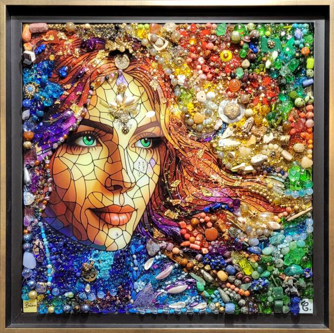 Clara TISSOT, Lalie, "Le temps n'appartient à personne. Ballet d'étoiles insaisissables. Instant présent, tu es l'essence du voyage." Mylène Farmer Oeuvre originale unique constituée de prierres semi-précieuses, pâtes de verre, cristaux Swarovski, perles fantaisies, éléments Haute Couture des années 1990 Réalisée par Clara TISSOT d'après un visuel créé par Art of Prima, 60*60