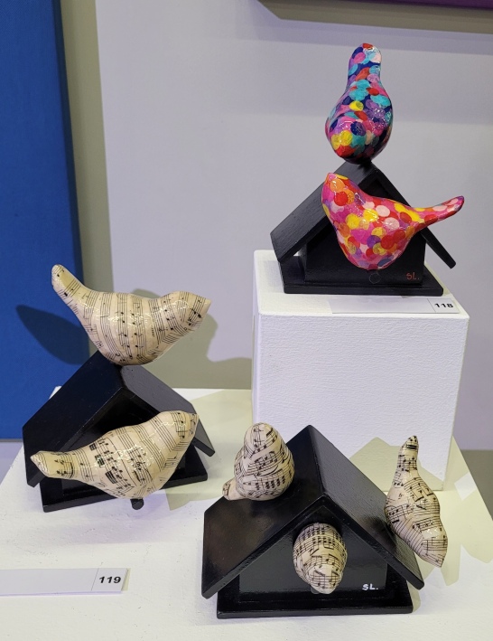 Séverine LORTEAU, Sophie, Papier mâché, P'tit nichoir 2, P'tit nichoir 3, et P'tit nichoir 1, Papier mâché/partitions/confettis