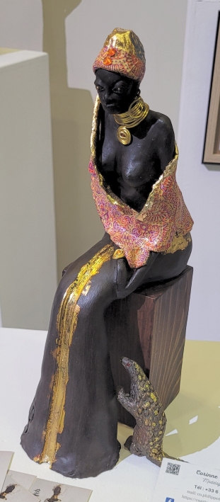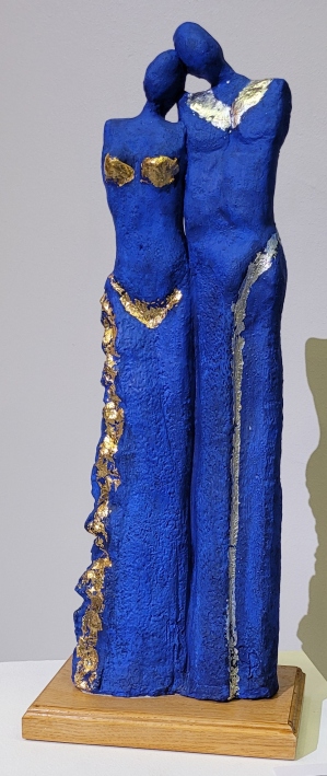 Corinne PHILIPPE, Coumba et le pangolin, Terre lisse/patine cire/papier collé/or, Blue love et Black love, Terre chamottée/patine/or