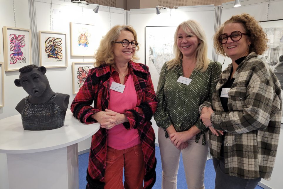 Véronique DUMONT reçoit l'appui moral de Séverine LORTEAU et de YANKA pour sa sculpture Le veilleur de l'autre monde, Bronze