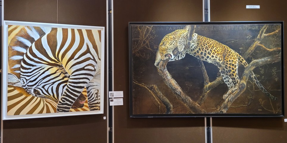 Danielle BECK, Zèbres n°3 du Masaï Mara, Huile sur toile, 80*80 et Panthère de Ranthambore, Huile sur toile, 89*146