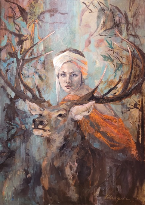 Cécile VILASEQUE, Cerf élaphe et la dame bleue, Huile