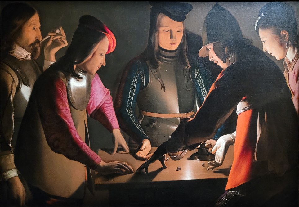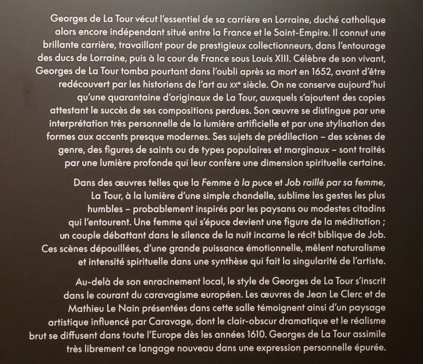 ***************************************************** Deux œuvres importantes de Georges De La Tour ne sont pas présentes dans cette exposition : La Diseuse de Bonne aventure, restée au Metropolitan Museum de New York et Le Tricheur à l'as de carreau, au Musée du Louvre La Diseuse de Bonne aventure, Huile sur toile, vers 1633-1639 Le Tricheur à l'as de carreau, Huile sur toile, vers 1633-1638 ****************************************************** D'autres artistes spécialistes du clair-obscur sont présentés dans la même exposition...