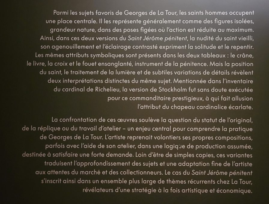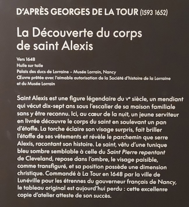 D'après Georges De La Tour, Saint Sébastien soigné par Irène, Huile sur toile, Vers 1640-1649 (d'après les sources, Louis XIII plaça l'original (perdu) dans sa chambre et en fit ôter toutes les autres toiles) Georges De La Tour, La Madeleine pénitente, Huile sur toile, Vers 1635-1640 (le crâne et le miroir évoquent la vanité des biens terrestres, tandis que la lumière, immatérielle, est une métaphore de l'élévation spirituelle) D'après Georges De La Tour, Saint François en extase, Huile sur toile, Vers 1640-1645 Georges De La Tour, La fillette au brasero, Huile sur toile, Années 1640 Georges De La Tour, Le Souffleur à la pipe, Huile sur toile, 1646 (le thème du souffleur - un personnage gonflant les joues pour ranimer une flamme - est largement répandu dans la peinture européenne des XVIe et XVIIe Siècles Ce type d'image, très prisé, décorait les intérieurs bourgeois et aristocratiques de la Lorraine du XVIIe Siècle) Georges De La Tour, Le reniement de Saint Pierre, Huile sur toile, 1650 (c'est à partir de cette toile qu'Hermann Voss a identifié Georges De La Tour en 1915 Offerte en étrennes au gouverneur de Lorraine, La Ferté, elle est le dernier tableau daté du peintre) Georges De La Tour, Les Joueurs de dés, Huile sur toile, Vers 1640 (malgré la signature de La Tour, l'œuvre présente des passages très travaillés et des éléments plus sommaires, ce qui suggère une possible intervention de l'atelier, voire d'Etienne De La Tour, son fils) Georges De La Tour, Saint Jean-Baptiste dans le désert, Huile sur toile, Vers 1650 ("Le réalisme sans fard, la lumière sourde, l'intensité spirituelle évoquent les ultimes œuvres de Caravage - que La Tour n'a cependant jamais vues")