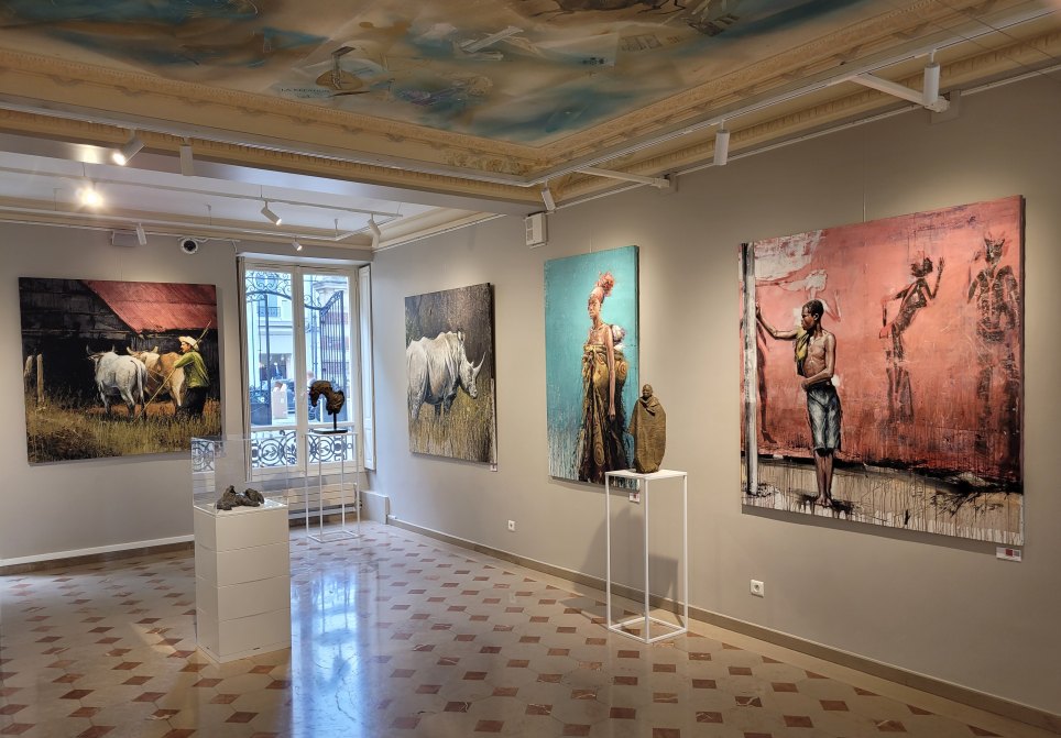 Mystique, Sculpture en bronze, 34*14*13, et Le Mythe, Sculpture en bronze, 64*34*24 Instinct, Sculpture en bronze, 40*20*12 Xaedan femme san, Acrylique sur cuivre, 40*40 Tambili, Huile et acrylique sur toile, 80*80 Downtown, Aquarelle, 51*36 Kalahari, Aquarelle, 51*36 Asha, Dévot et Pêcheur, Technique mixte, 150*50 Matin aux salines, Huile sur bois, 38*46 Rose, Huile sur bois, 46*38 Barber, Huile sur cuivre, 40*40 Gardienne des traditions, Sculpture en bronze, 43*20*20 Naya, Huile et acrylique sur toile, 100*100 Pick up man, Huile et acrylique sur toile, 120*120 Pablo, Huile et acrylique sur toile, 100*80 Kifaru, Huile et acrylique sur toile, 150*150