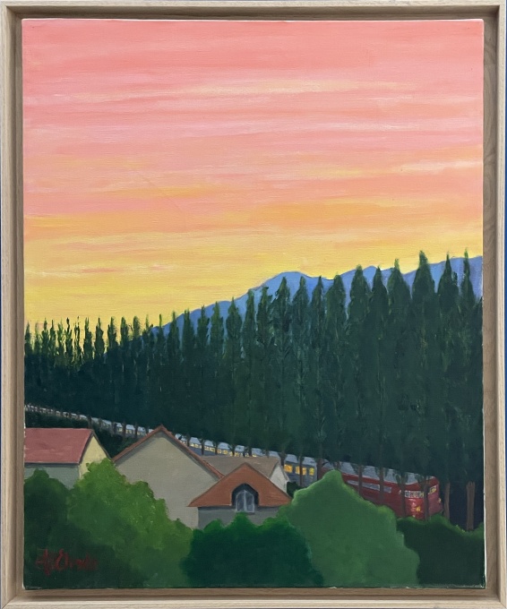 Éliade ANDRÉ, Le chemin de fer à Esbly au crépuscule, Huile sur toile, 1974