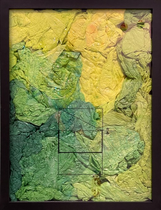 Elsa TOMKOWIAK, Kelvin K3B, Film biodégradable, peinture acrylique, froissé dans cadre, 2018-2022