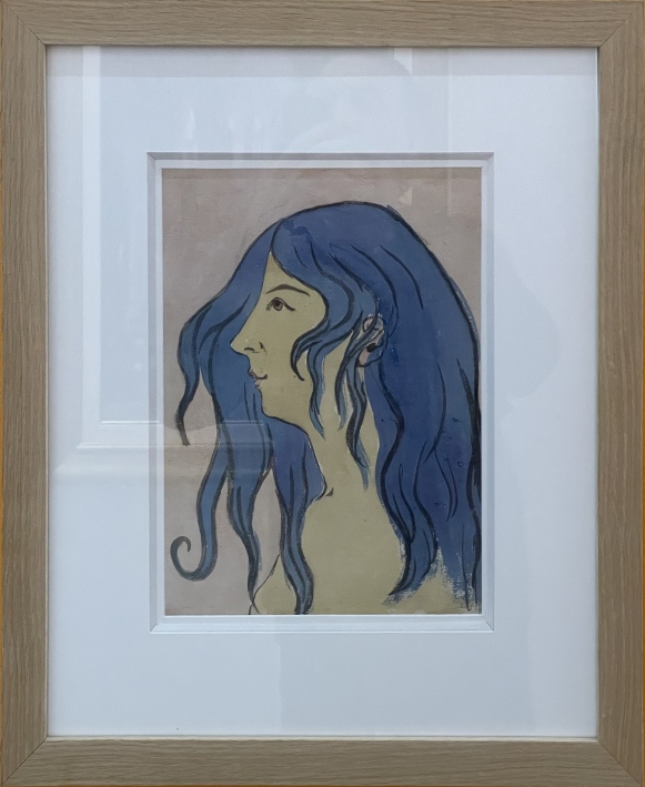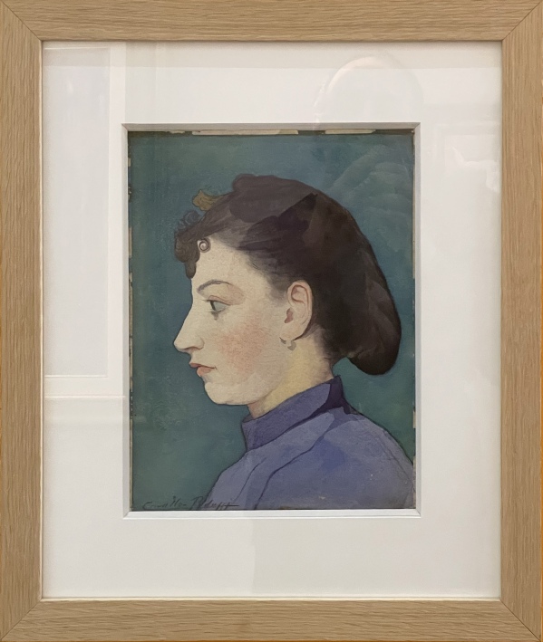 Émile CAVALLO-PEDUZZI, Léa Vauville de profil sur fond bleu-vert, Dessin à la plume, aquarelle sur papier