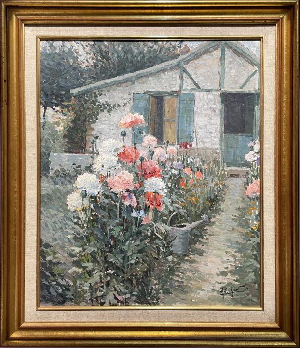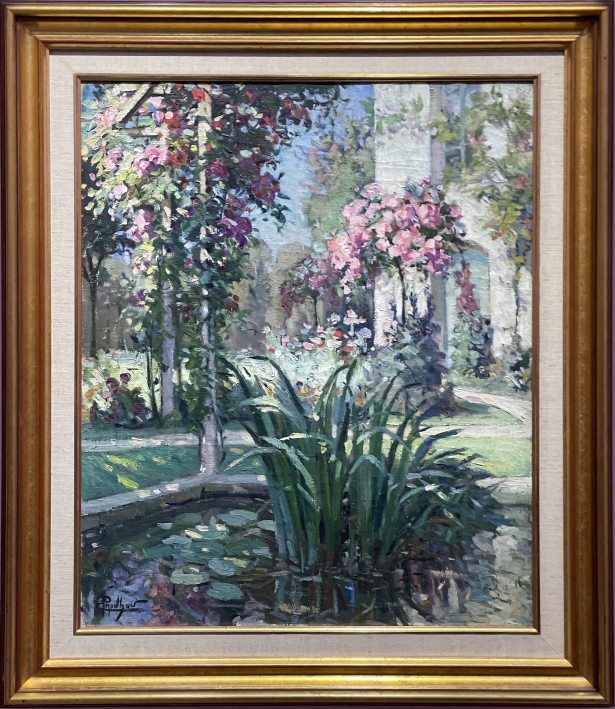 Émile PRODHON, Jardin fleuri et bassin, Huile sur toile