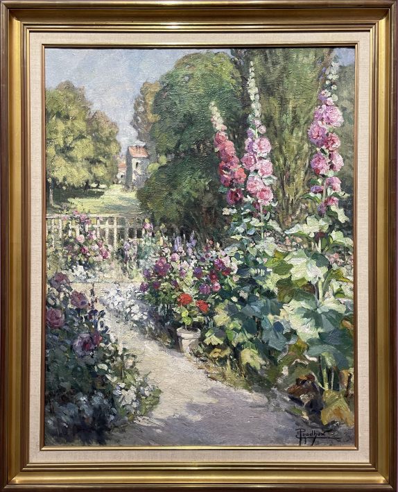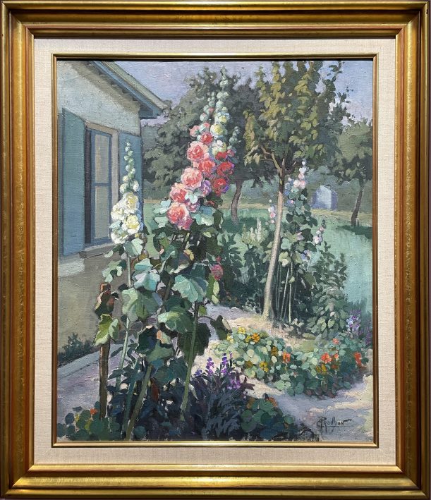 Émile PRODHON, Jardin avec roses trémières et géraniums, Huile sur toile