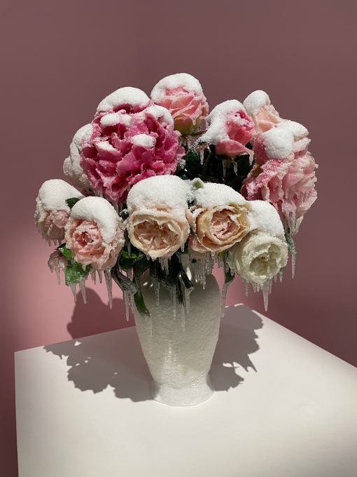 Laurent PERNOT, Nature morte, bouquet d'été, Vase, fleurs et neige artificielles, résine, verre, vernis