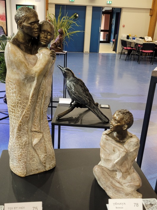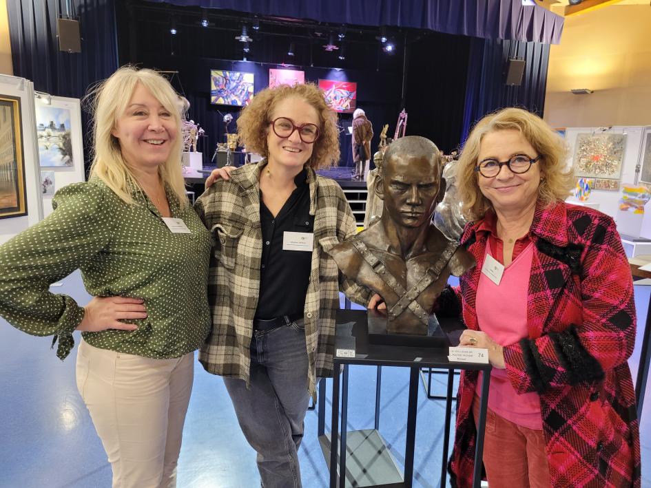 Véronique DUMONT reçoit l'appui moral de Séverine LORTEAU et de YANKA pour sa sculpture Le veilleur de l'autre monde, Bronze