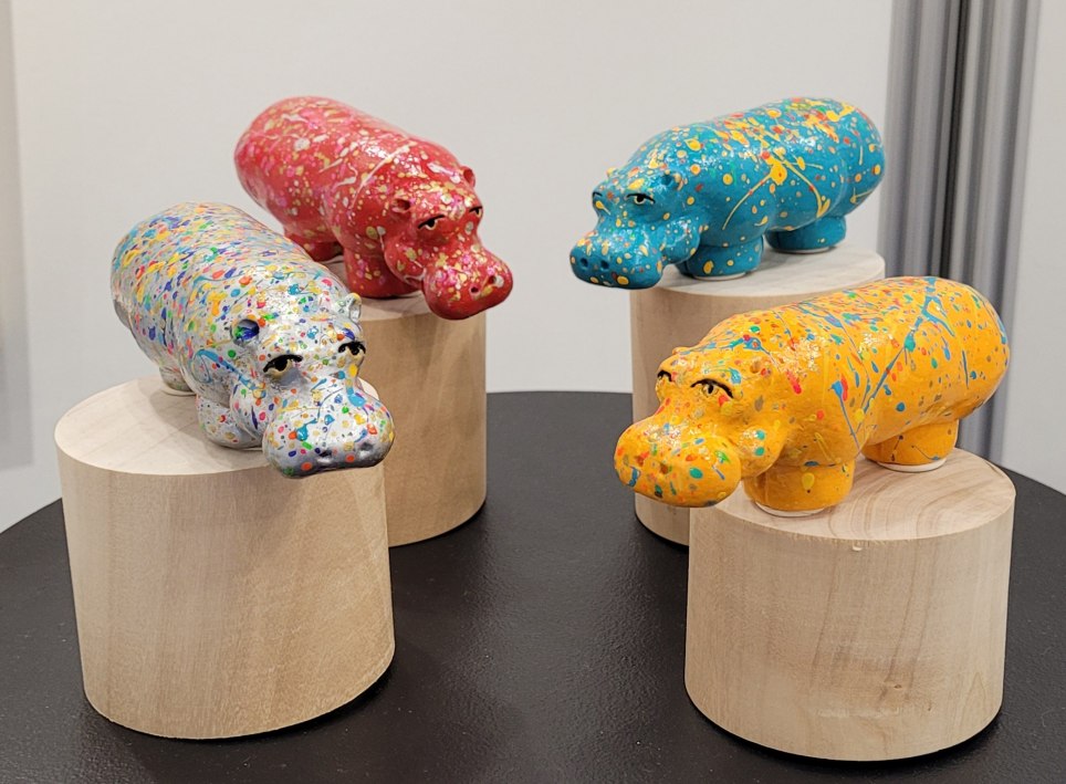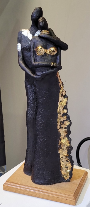 Corinne PHILIPPE, Coumba et le pangolin, Terre lisse/patine cire/papier collé/or, Blue love et Black love, Terre chamottée/patine/or