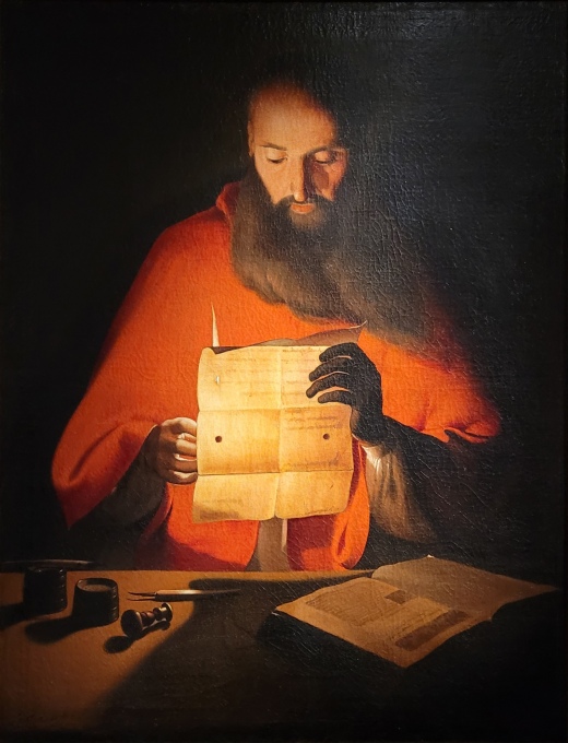 Georges De La Tour, Saint Philippe, Huile sur toile, Vers 1620 (Plusieurs portraits de saints proviennent d'une commande inconnue reçue par l'artiste au début de sa carrière : un "apostolado", ensemble de treize toiles représentant le Christ et les douze apôtres, série conservée autrefois à la cathédrale d'Albi et dispersée à la Révolution ; six portraits d'apôtres originaux subsistent, certains récemment redécouverts)