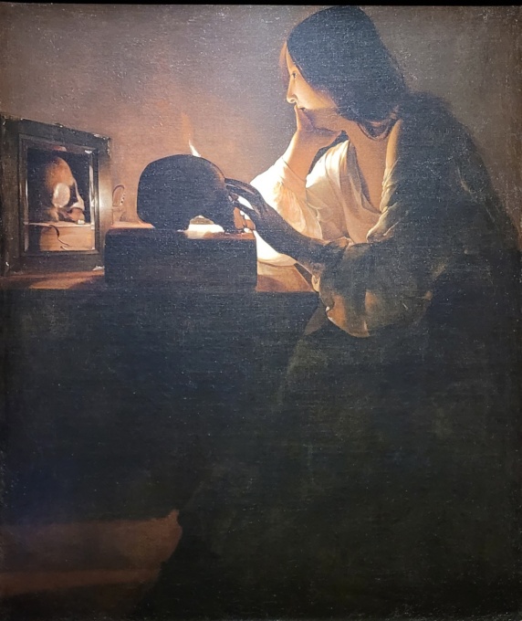 Georges De La Tour, La Madeleine pénitente, Huile sur toile, Vers 1635-1640 (le crâne et le miroir évoquent la vanité des biens terrestres, tandis que la lumière, immatérielle, est une métaphore de l'élévation spirituelle)