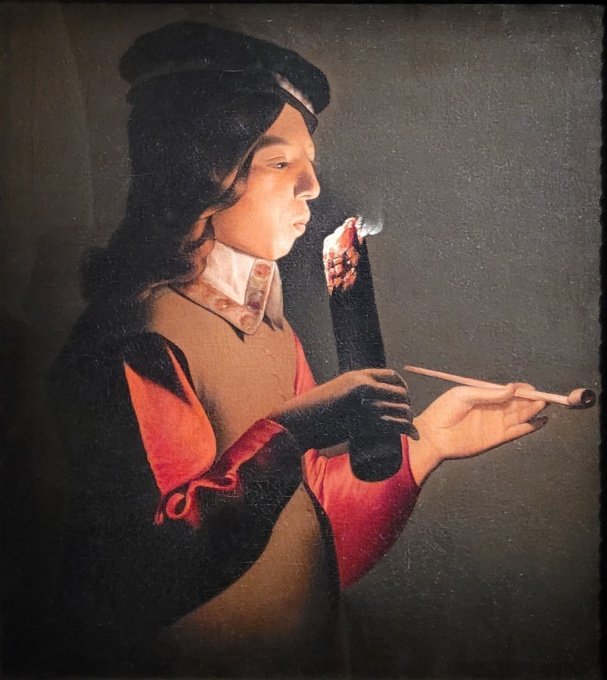 Georges De La Tour, Le Souffleur à la pipe, Huile sur toile, 1646 (le thème du souffleur - un personnage gonflant les joues pour ranimer une flamme - est largement répandu dans la peinture européenne des XVIe et XVIIe Siècles Ce type d'image, très prisé, décorait les intérieurs bourgeois et aristocratiques de la Lorraine du XVIIe Siècle)