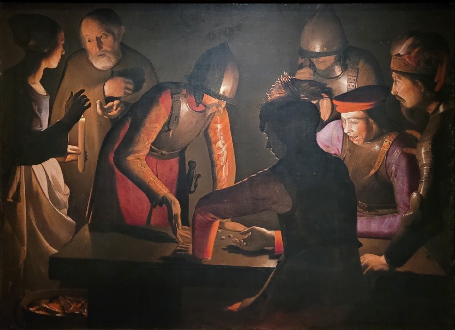 Georges De La Tour, Les Joueurs de dés, Huile sur toile, Vers 1640 (malgré la signature de La Tour, l'œuvre présente des passages très travaillés et des éléments plus sommaires, ce qui suggère une possible intervention de l'atelier, voire d'Etienne De La Tour, son fils)