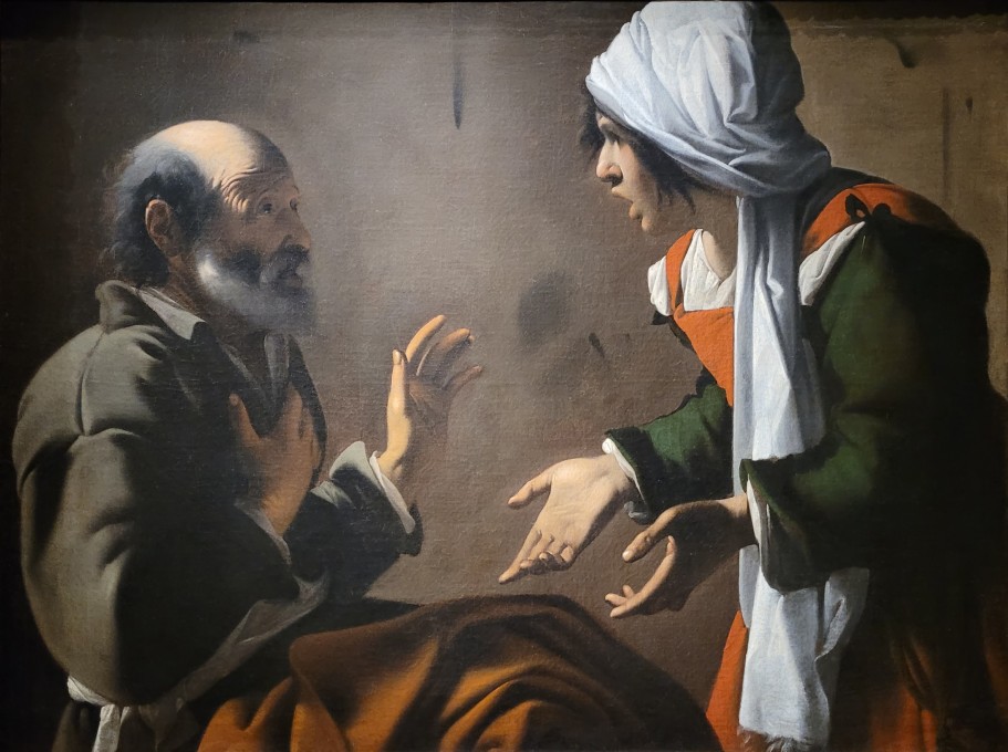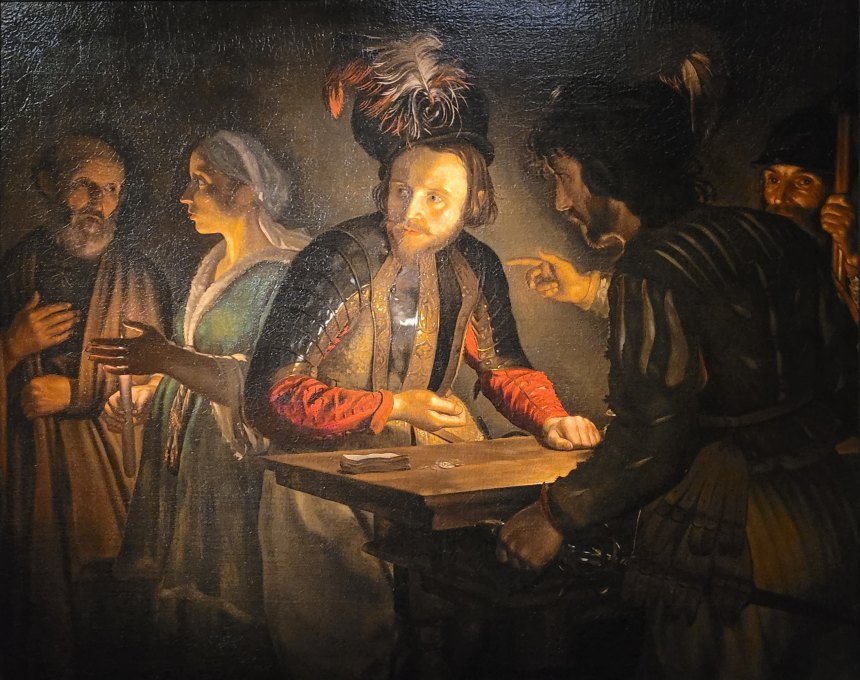 Georges De La Tour, Le reniement de Saint Pierre, Huile sur toile, 1650 (c'est à partir de cette toile qu'Hermann Voss a identifié Georges De La Tour en 1915 Offerte en étrennes au gouverneur de Lorraine, La Ferté, elle est le dernier tableau daté du peintre)