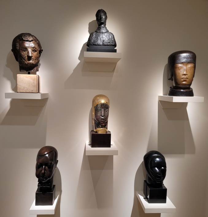 Les visages de l'École de Paris : Léon INDENBAUM, Portrait de Chaïm Soutine, buste de Jeanne Hébuterne et portrait de Foujita, Chana ORLOFF, Lucien Vogel, 1921, Joseph CSAKY, Tête de femme, 1924, et Auguste ZAMOYSKI, Portrait de Louis Marcoussis