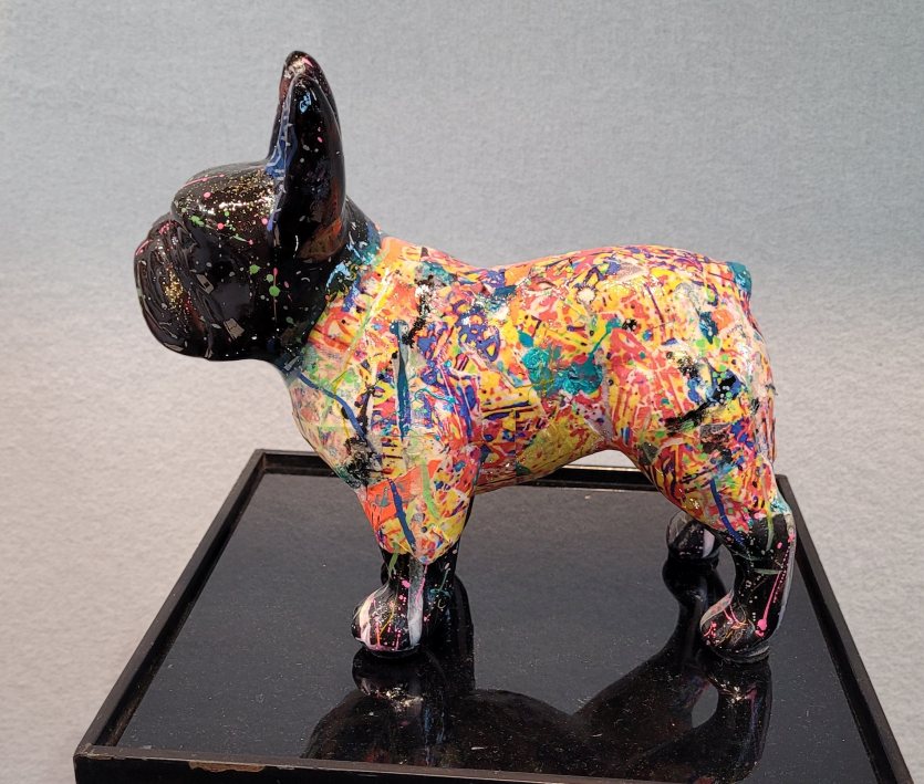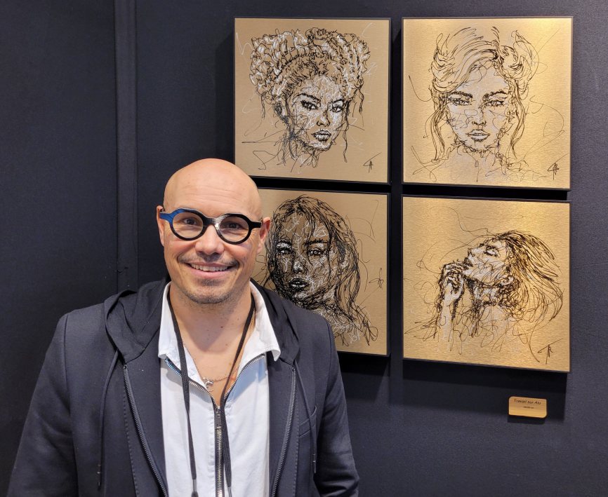 Sébastien ALLART près de ses œuvres sur alu, 30*35,