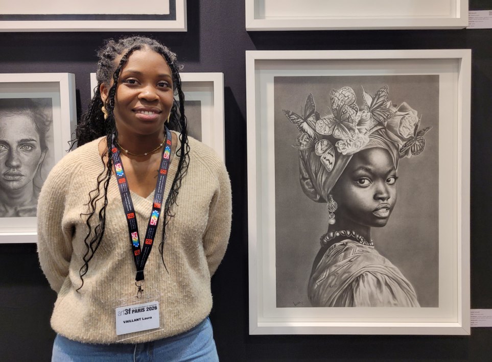Laura VAILLANT près de "Entre alas y rosas", Crayon à papier, graphite et fusain sur papier à dessin Fabriano 100 % coton, 56,6*76,6