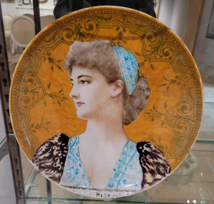 "Pour financer ses débuts, Paul HELLEU collabore avec le grand céramiste Théodore DECK. Il peint sur faïence des portraits stylisés, souvent de profil, dans un goût inspiré de la Renaissance italienne"