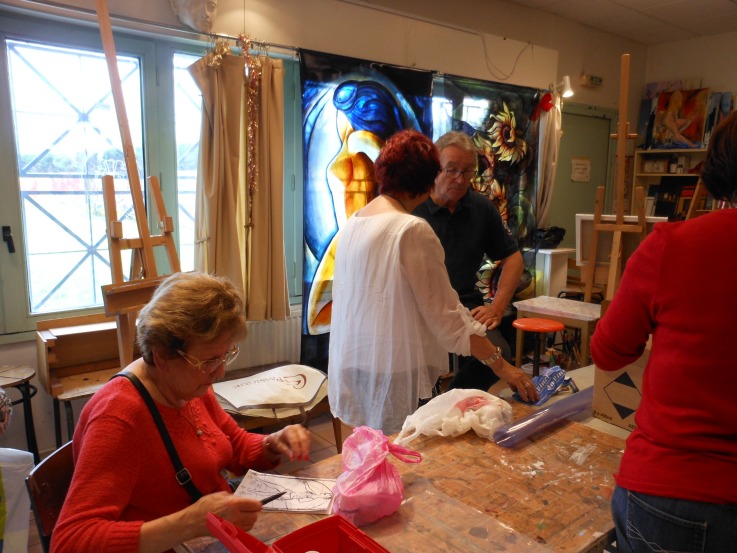 Bernard Voillot animait un atelier pour la maîtrise assez particulière de la peinture vitrail les jeudis 12 et 19 mai 2016 à la salle Ameller pour les kakémonos de la future exposition de septembre 2016 aux églises