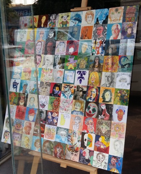 Corynne Sculfort devant la "Fresque des artistes confinés" qu'elle vient de terminer " Samedi 23 mai 2020 : "200 portraits et 2 m2 pour montrer les différents états d'âme des "artistes confinés"... Merci encore à tous les participants."
