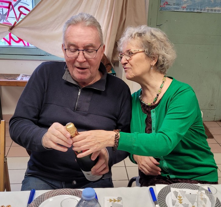 A la fin du repas, il reste du crémant dans une bouteille et le webmaster Daniel Vittecoq appelle les convives sur le départ au dévouement... (photo Anne-Marie Rosiñol)