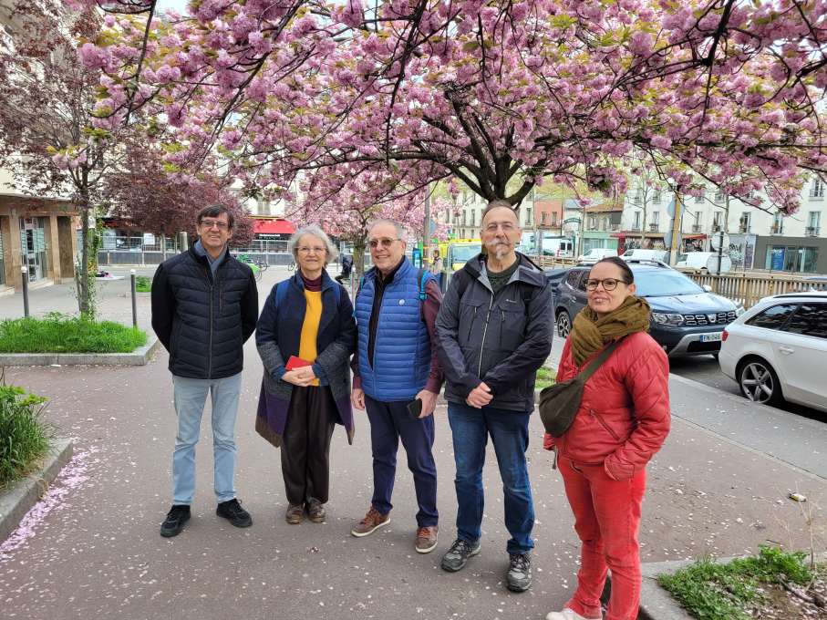 Sous les cerisiers en fleurs de la Place Bienvenüe : Hervé Jeandot, Jean-Luc Charpiot, Président de l'Académie des Arts de Gournay, Pierre Sacovy, Daniel Vittecoq et Anne-Marie Rosiñol, de l'Amicale artistique Chelloise (photo Corynne Sculfort, Présidente de l'Amicale)