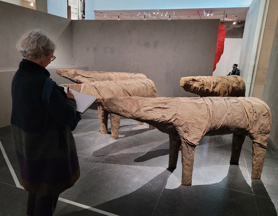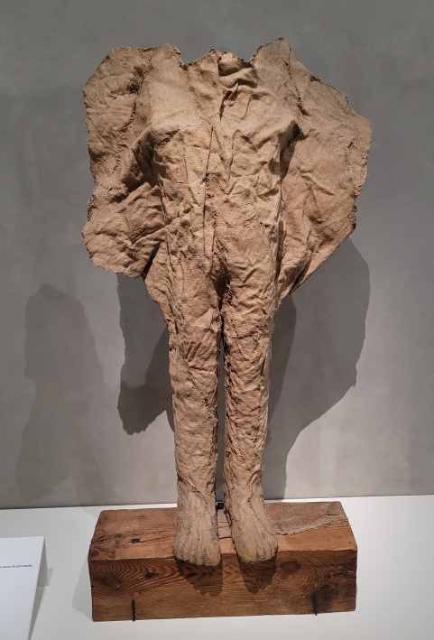 Mutants debout, 1992-1994, Toile de jute, résine et armature d'acier ("Quelles sont ces étranges bêtes ? Chiens, cochons, fourmiliers, animaux préhistoriques ou du futur ? Debout ou assis, ils nous semblent familiers - et pourtant, il est difficile de les nommer")
