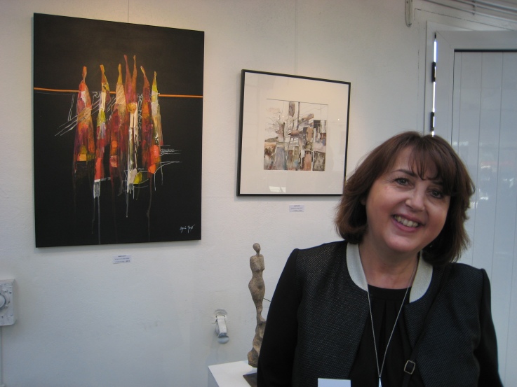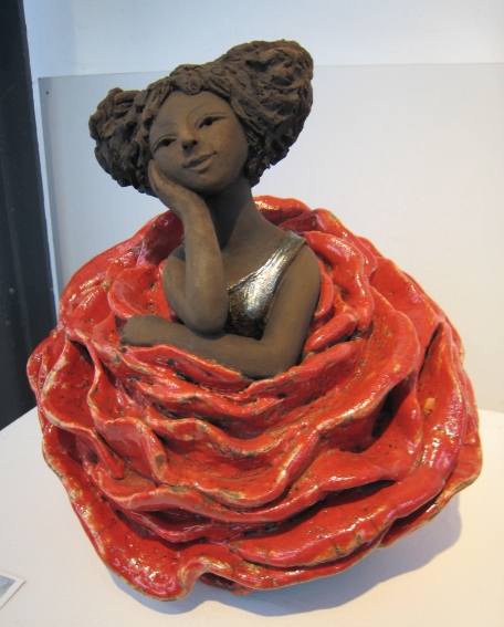 Hilda Soyer, sculptrice céramiste, derrière 4 de ses oeuvres