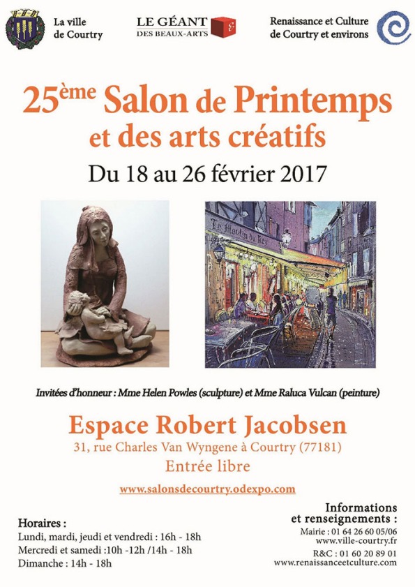 Pour sa 25e édition, le Salon de Printemps de Courtry accueille comme invitées d'honneur Helen Powles, de l'Amicale Artistique Chelloise, et Raluca Vulcan Trois autres artistes de l'Amicale sont également présents : Isabelle Corcket, Einado et Dominique Fourgeot Nous étions au vernissage du vendredi 17 février 2017