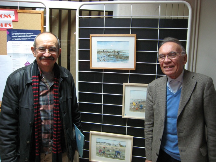 Bernard André et Jacques Mahéas, Maire de Neuilly-sur-Marne, devant trois aquarelles de l'artiste