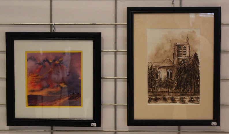 Madeleine Cartier-Bernardeau, Ciel embrasé, Aquarelle et L'église de Saint Georges - Crécy, Aquarelle - encre - sépia