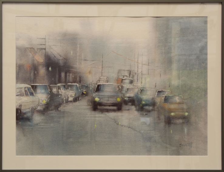 Errbet, Des parapluies dans la ville, Huile sur toile au couteau