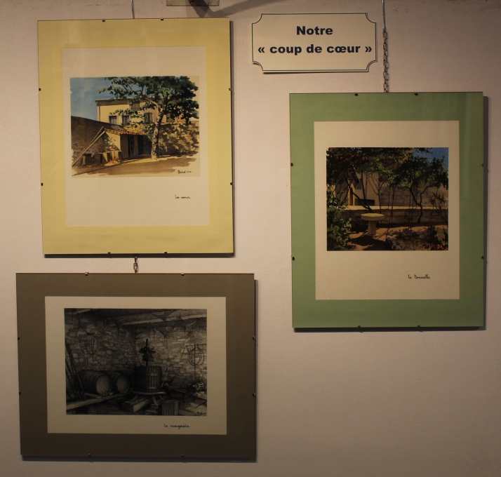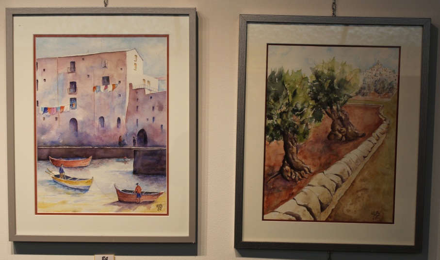 Annie VERSCHUEREN, Fin de soirée, Aquarelle, et Jérôme BERTHAULT, Village de l'Hermitage et Fontaine Médicis, Aquarelle