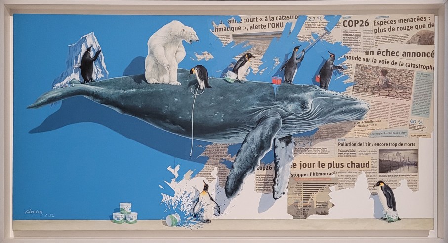 Olivier CLAUDON, Arctic tragic, Le mur de la honte, Acrylique sur toile, coupures de journaux, 50 x 100