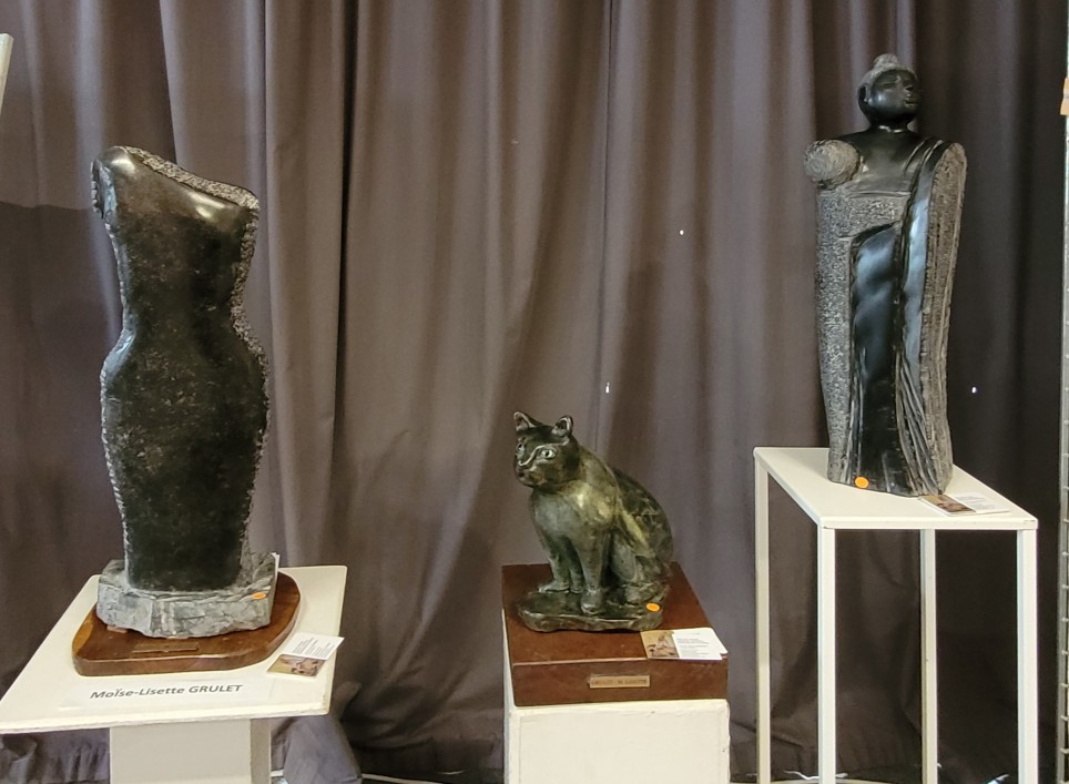 Moïse Lisette GRULET, Sveltesse, Taille directe marbre noir, Le matou, Taille directe serpentine, et Mère et fille, Taille directe marbre noir