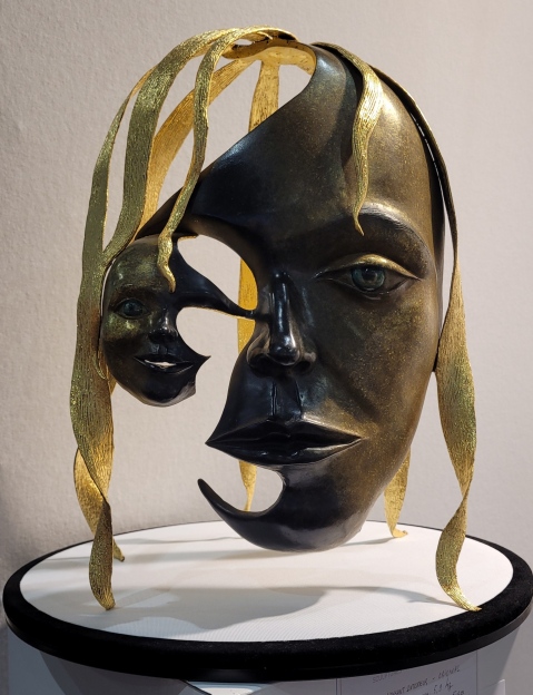 Véronique VIGNERON, L'Enfant intérieur, Face et dos sur plateau tournant, Bronze doré à la feuille d'or 24 carats, 48*28*25