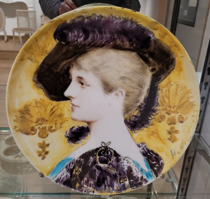 "Pour financer ses débuts, Paul HELLEU collabore avec le grand céramiste Théodore DECK. Il peint sur faïence des portraits stylisés, souvent de profil, dans un goût inspiré de la Renaissance italienne"