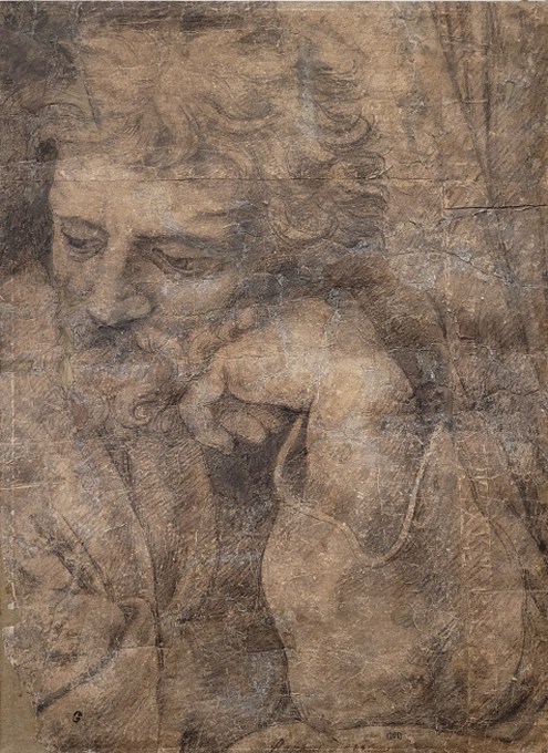 Giulio PIPPI, dit Giulio ROMANO, Saint Joseph, Vers 1518, Pierre noire, sur papier lavé à l'encre brune