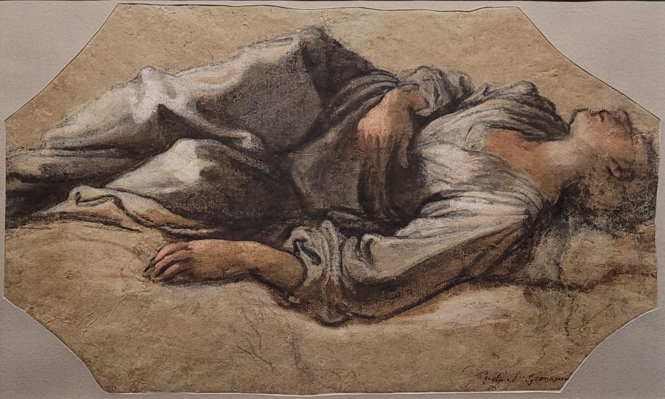 Giovanni MANNOZZI, dit Giovanni da San Giovanni, Femme couchée sur le dos, 1ère moitié du 17e S Pierre noire, encre noire et lavis brun, rehauts de blanc, pastel et gouache ou huile sur papier lavé d'ocre